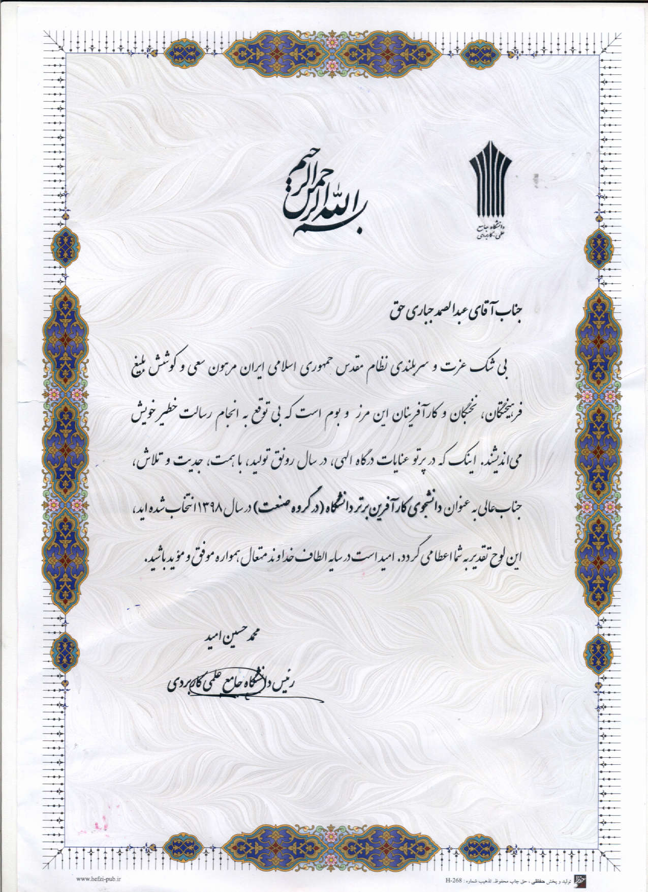 در راستای نیل به اهداف دانشگاه کارآفرین و کسب کرسی های برتر دانشگاهی توسط واحد استانی آذربایجان شرقی در زمینه های مختلف علمی، پژوهشی و آموزشی، این بار واحد استانی دانشگاه، شاهد کسب مقام کارآفرین برتر دانشگاه در حوزه صنعت و در سطح کشوری توسط آقای عبدالصمد جباری حق دانشجوی مرکز آموزش علمی کاربردی شهرداری تبریز در سال ۱۳۹۸ گردید.