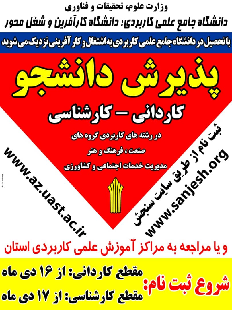 پذیرش مرحله «تکمیل ظرفیت» در دورههای کاردانی و کارشناسی حرفهای (ناپیوسته) مهرماه سال ۱۳۹۹ دانشگاه جامع علمی کاربردی در بهمن ماه آغاز شد