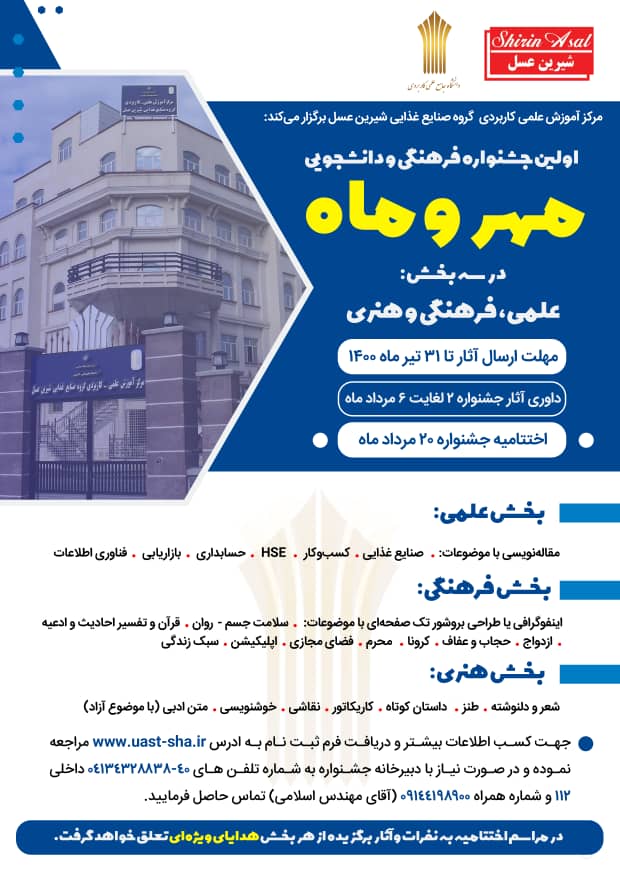 اولین جشنواره علمی،فرهنگی و هنری با نام مهر و ماه توسط مرکز آموزش علمی کاربردی گروه صنایع غذایی شیرین عسل تبریز در نیمه اول سال 1400 برگزار می گردد.